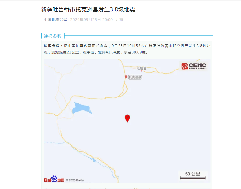 根据中国地震台网消息:9月25日19时53分在新疆吐鲁番市托克逊县发生3.8级地震,震源深度21公里,震中位于北纬41.64度,东经88.69度无人区。