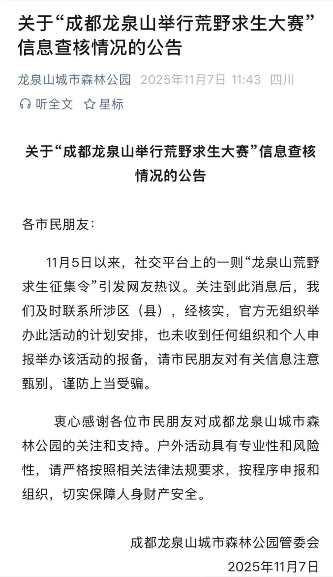 11月7日,成都龙泉山城市森林公园管委会发布官方通告称,经核实,官方无组织举办此活动的计划安排,也未收到任何组织和个人申报举办该活动的报备,请市民朋友对有关信息注意甄别,谨防上当受骗。